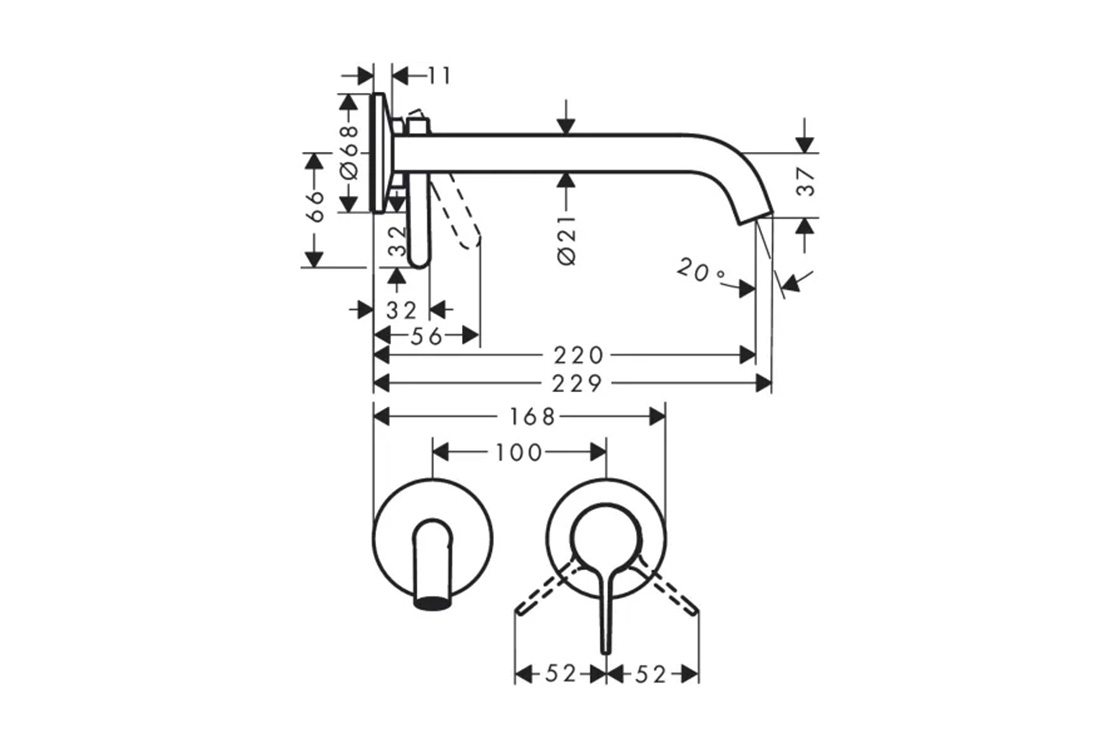 складається з: одноважільного змішувача для раковини прихованого настінного монтажу, зливного комплекту,виступ: 220 мм,тип спрею: звичайний спрей,максимальна витрата води при 3 барах: 5 л/хв,ручка може бути розташована праворуч або ліворуч, в залежності від базового комплекту установки,необхідне додаткове обладнання: прихована частина для змішувача зі стіни (арт.13623180) (не входить в комплект).