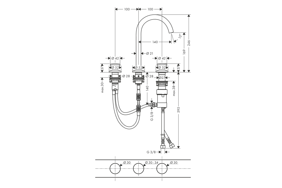 складається з: змішувача для умивальника на 3 отвори, зливного комплекту push-openComfortZone 170,виступ 140 мм,кут повороту виливу: 120°,тип струменя: звичайний,максимальна витрата води при 3 барах: 5 л/хв,права рукоятка: картридж Select для регулювання температури,ліва рукоятка: контроль напору води,регульоване обмеження температури,підходить для проточних водонагрівачів,зливний клапан Push-Open G 1 ¼,тип з'єднання: G ⅜..технології: AirPower (потік води, насичений повітрям, запобігає розбризкуванню), Select (регулювання кнопкою).