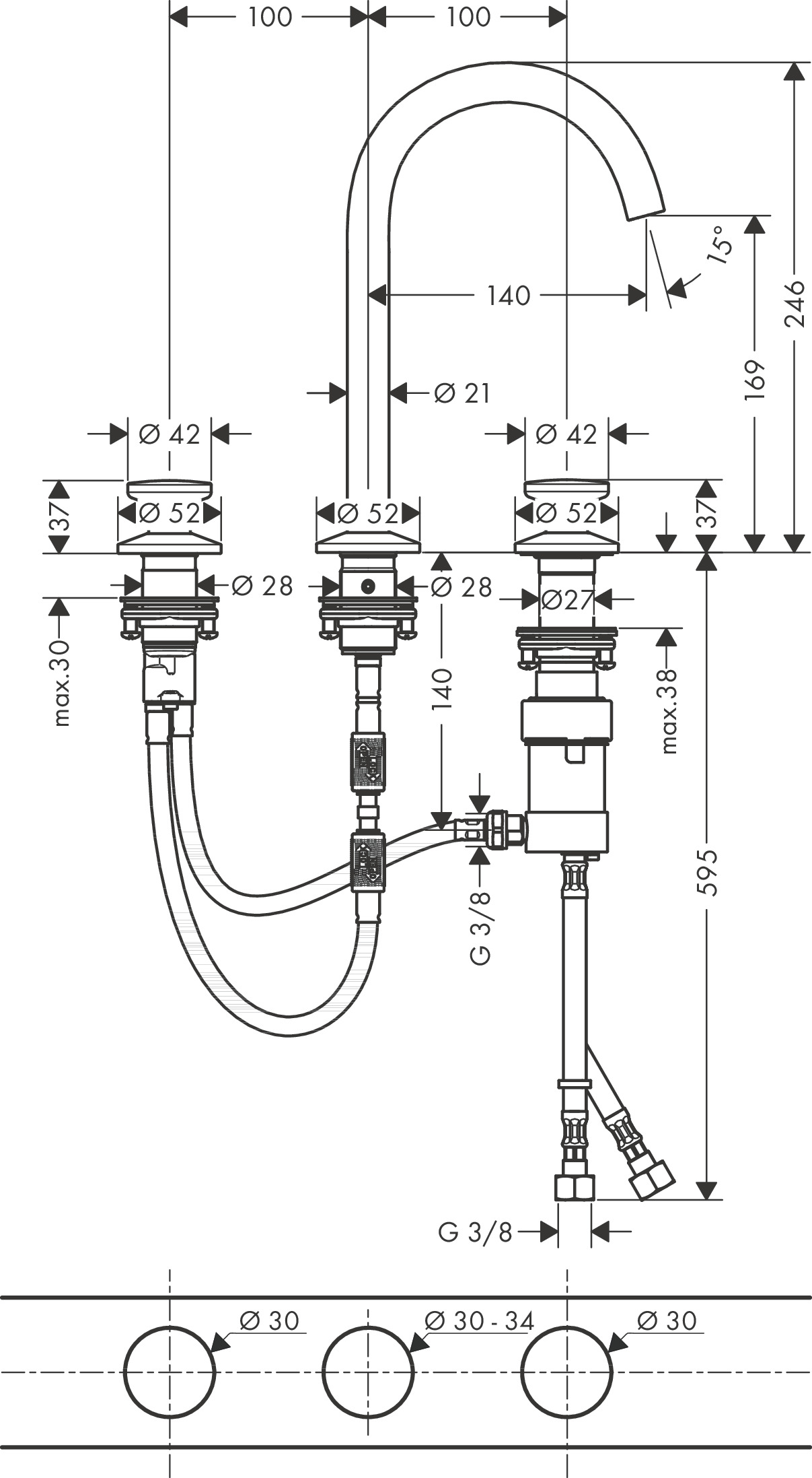 складається з: змішувача для умивальника на 3 отвори, зливного комплекту push-openComfortZone 170,виступ 140 мм,кут повороту виливу: 120°,тип струменя: звичайний,максимальна витрата води при 3 барах: 5 л/хв,права рукоятка: картридж Select для регулювання температури,ліва рукоятка: контроль напору води,регульоване обмеження температури,підходить для проточних водонагрівачів,зливний клапан Push-Open G 1 ¼,тип з'єднання: G ⅜..технології: AirPower (потік води, насичений повітрям, запобігає розбризкуванню), Select (регулювання кнопкою).