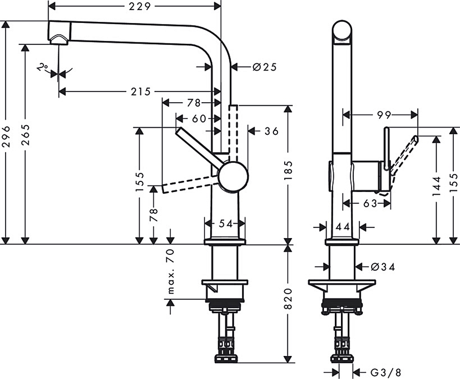 Поворотний злив регулюється в 4 кроки 60 °, 110 °, 150 ° або 360 °. Витрати води: 8,4 л/хв.