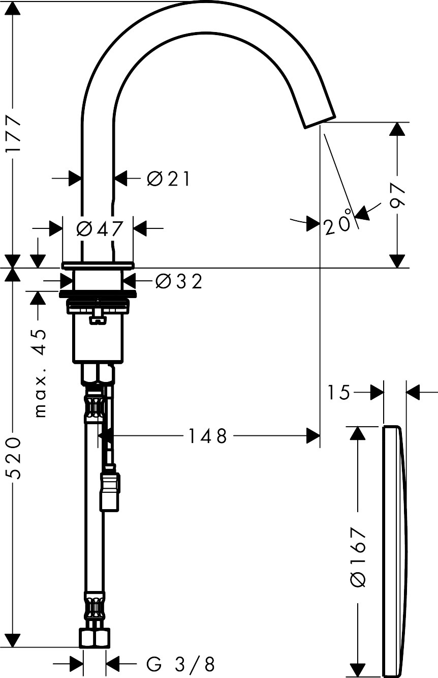 Електронний змішувач для умивальника прихованого монтажуComfortZone 100,проекція: 148 мм,тип спрею: звичайний спрей,максимальна витрата при 3 барах: 3,5 л/хв,температура регулюється через базовий набір,підходить для проточних водонагрівачів,технологія інфрачервоного датчика, що спрацьовує при наближенні,автоматична адаптація інфрачервоного датчика до навколишнього середовища,регульований оптичний діапазон інфрачервоного датчика (2 налаштування),підключення до мережі 230 В/50 Гц,час роботи: 10 с,активоване гігієнічне промивання (автоматичний потік води),частота гігієнічних промивань: 24 год, тривалістю 10 с,можливість постійного промивання (один потік води протягом 180 секунд, підходить для термічної дезінфекції),ручна зупинка води для миття умивальника,приєднувальний розмір: DN15,фільтри бруду в з'єднувальних шлангах,необхідне додаткове обладнання: прихована частина для електронного змішувача Axor One (арт.16182180) (не входить в комплект).