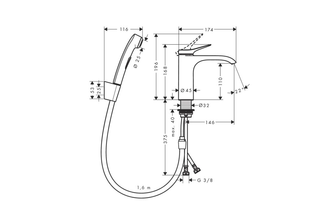 складається з: одноважільного змішувача для раковини, ручного душу-біде, тримача для душу, душового шланга, зливного набору,ComfortZone 110,проекція: 146 мм,висота носика: 110 мм,тип розпилення: WaterfallStream,максимальна витрата при 3 барах: 4,4 л/хв,зливний набір Push-Open G 1¼,розмір: DN15.