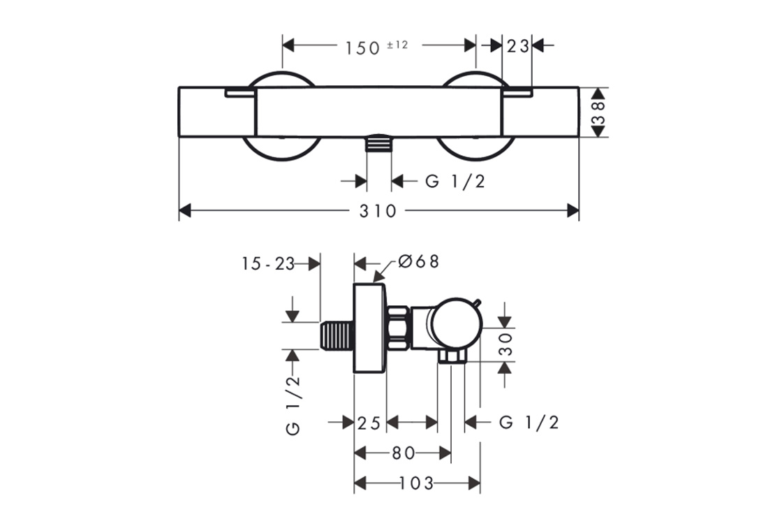 1 функція;контроль температури води;Water Flow Control контроль витрати води - кількість води можна точно відрегулювати за допомогою регулятора;кнопка EcoStop+ використання води регулюється максимум до 6 л/хв;SafetyStop безпечна зупинка при 40 °C;регулюється обмеження температури;зворотний клапан;матеріал ручок: метал;міжцентрова відстань: 150 ± 12 мм;приєднувальний розмір: DN15;тип з'єднання: s-подібні з'єднання, G ½;фільтр бруду в комплекті