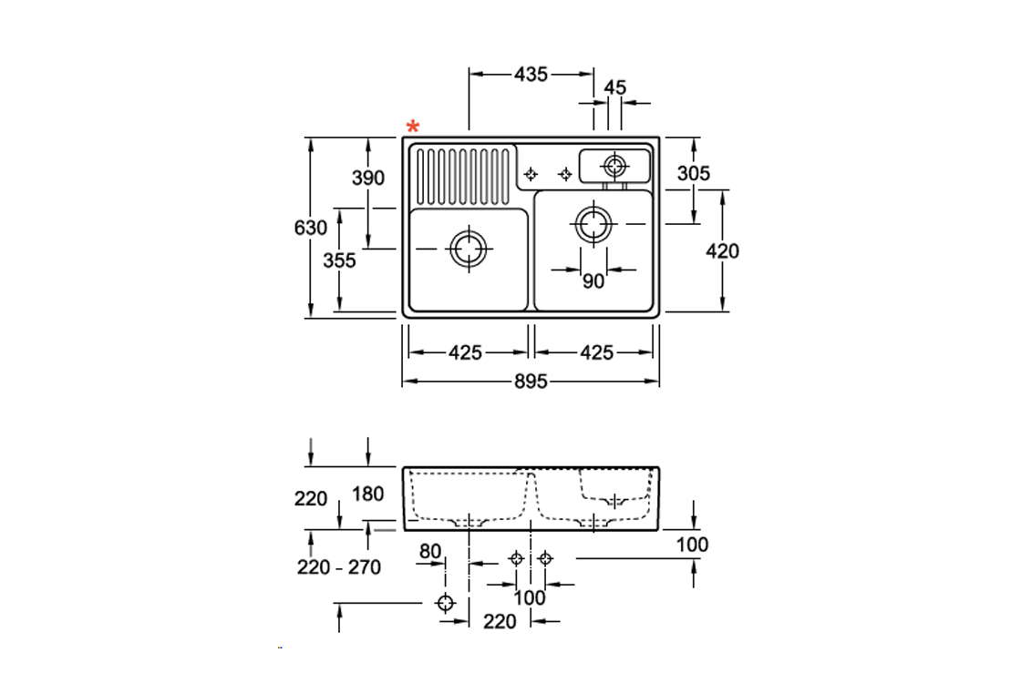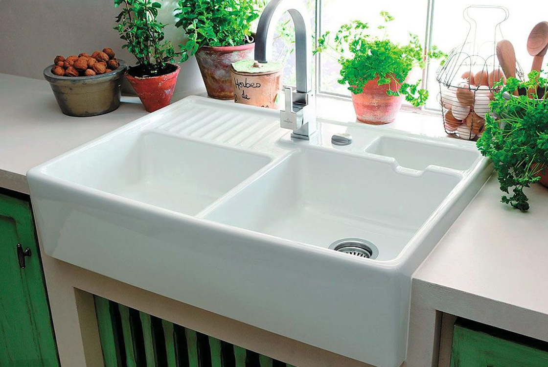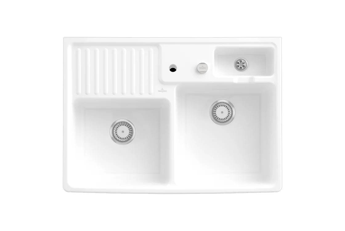 Керамічна кухонна мийка на 2 чаші та з невеликою чашею для відходів. Має 2 отвори: під змішувач та під круглий зливний набір з ручним відкриванням. Внутрішня глибина 18 см. Кераміка з покриттям CeramicPlus для запобігання утворення вапняного нальоту. Матеріал з високою стійкістю до ударів і подряпин та з дуже низьким ризиком пошкодження.
