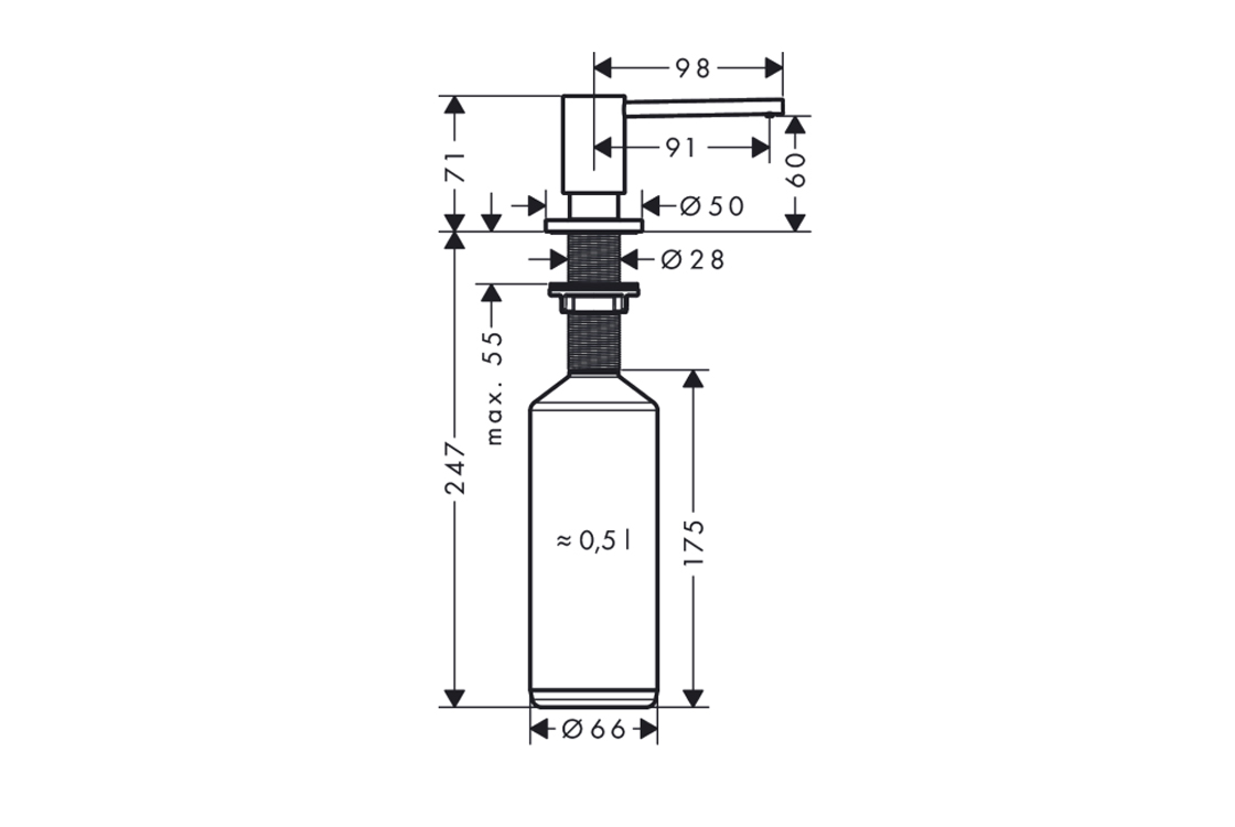 виступ 91 мм;місткість наповнення 500 мл;дозування 2 мл;легко наповнюється зверху;для установки в стільниці товщиною до 55 мм;монтажний отвір діаметром 28-35 мм.