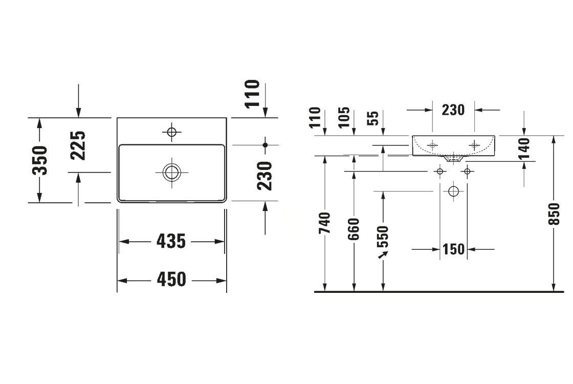 Умивальник з отвором під змішувач, без переливу. Виготовлений з інноваційного матеріалу DuraCeram®