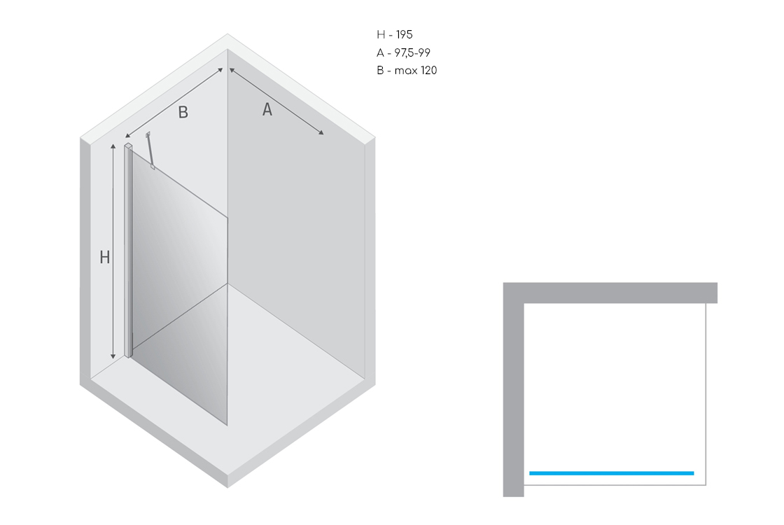 Статична душова перегородка відкритого типу walk in. Безпечне загартоване прозоре скло товщиною 6 мм із захисним покриттям Active Shield. Профільна система монтажу перегородки являє собою класичний спосіб примикання скла до стіни за допомогою алюмінієвого профілю. Надійну фіксацію скла забезпечує рухомий тримач прямокутної форми.