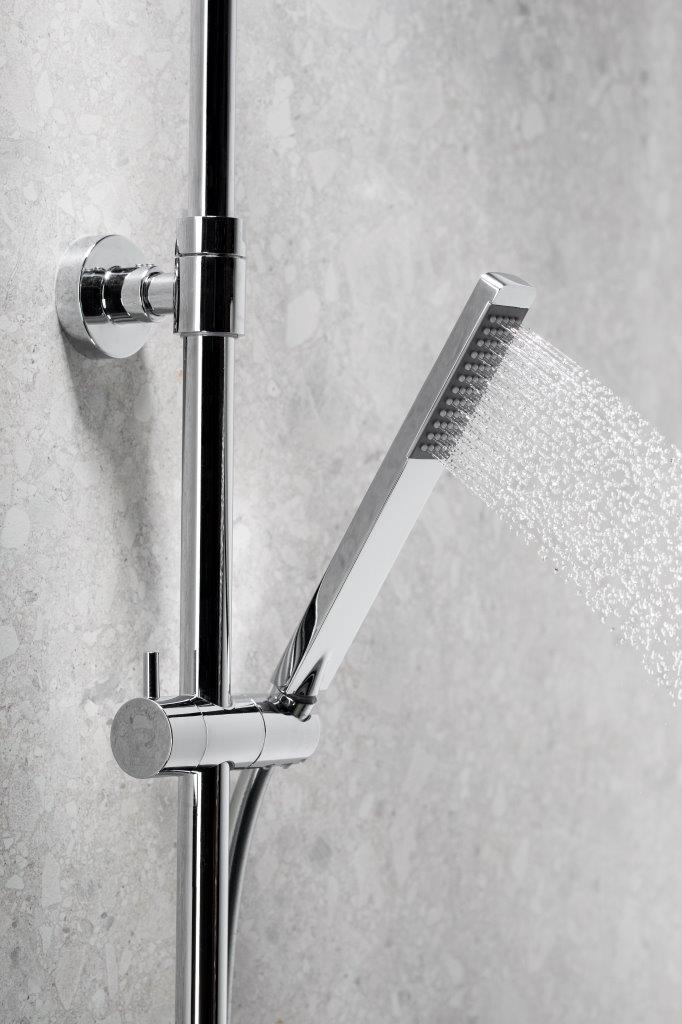 Дизайн всього виробу послідовний - квадратний диск верхнього душу ідеально поєднується з кубічною формою термостатичного змішувача. Важливо, що форма ручок – це не тільки зовнішній вигляд, це ще й ергономічність: ми впевнені, що вона не вислизне з мокрих рук. Вбудований перемикач душу обладнано обмежувачем для комфортного використання вибраного режиму - ручний душ або верхній душ.