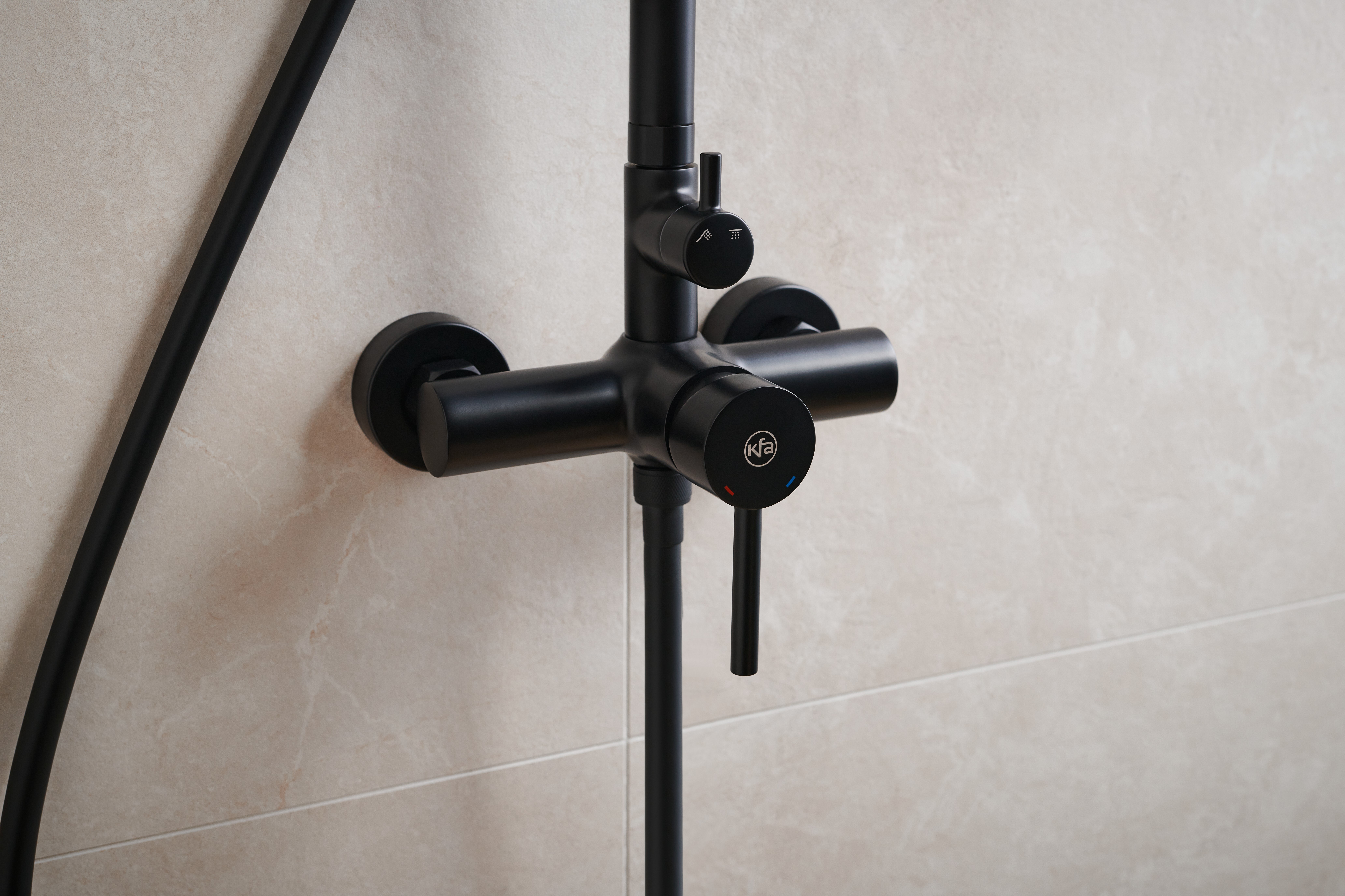 Душова система KFA Armatura Moza 5036-910-81 Black - це вишуканий і функціональний продукт, який створений, щоб забезпечити вам максимальний комфорт і задоволення під час купання. Ця система поєднує в собі стильний дизайн і передові технології, що робить її ідеальним вибором для вашої ванної кімнати.