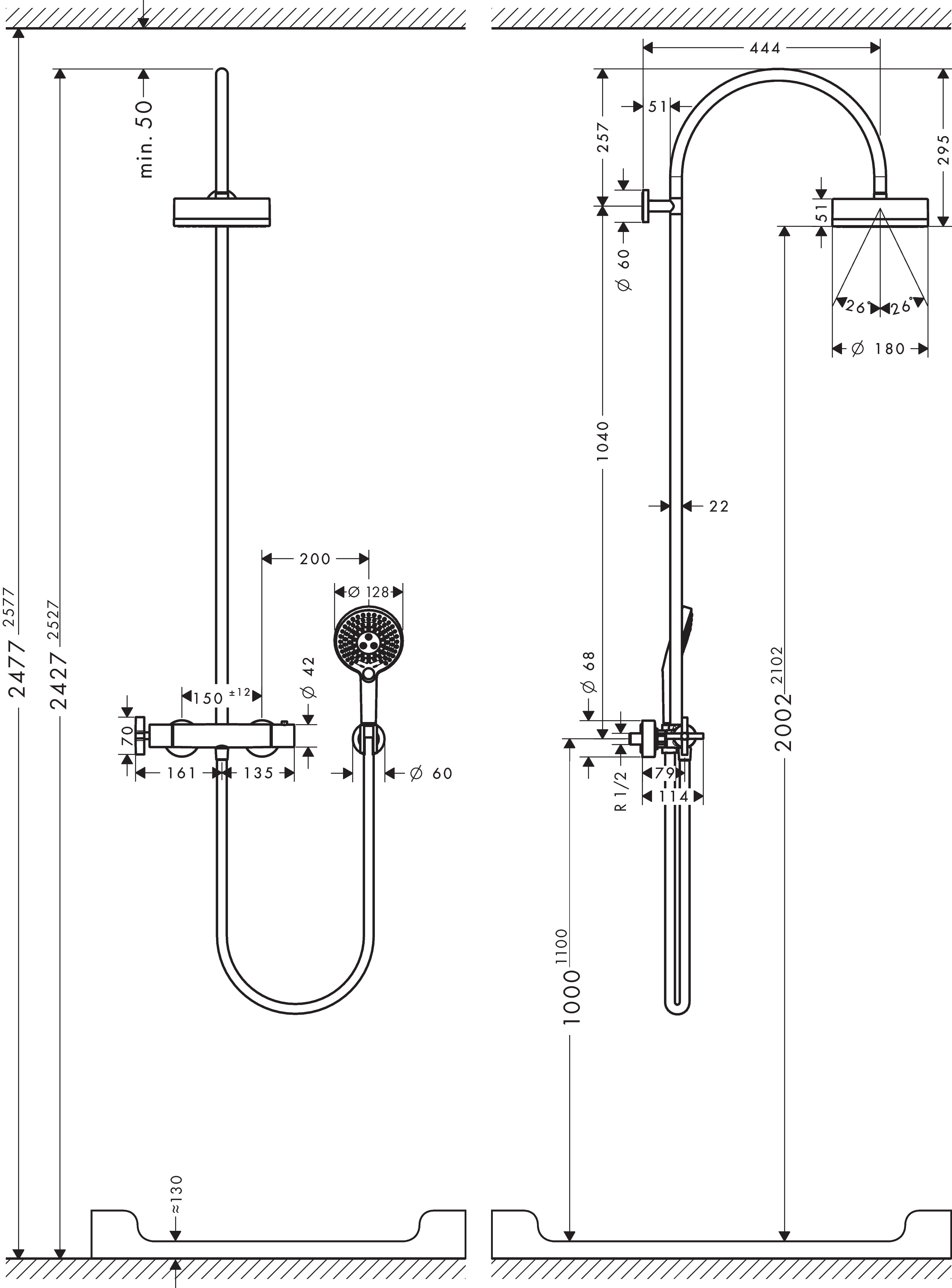 Axor складається з: верхнього душу, ручного душу, душового термостата, душового шланга, тримача для душу,тип розпилювача верхнього душу: Rain,розмір верхньої душової лійки: 180 мм,кульовий шарнір: верхній душ регулюється кутом нахилу,максимальна витрата верхнього душу при 3 барах: 17 л/хв,тип розпилювача ручного душу: RainAir, Rain, Whirl,витрата ручного душу при 3 барах: 14,9 л/хв,мінімальний тиск потоку: 1 бар, макс. робочий тиск: 10 бар,діаметр душової штанги: 22 мм,підставка для ручного душа,довжина плеча верхнього душу: 444 мм,безпечна зупинка при 38°C,регульоване обмеження гарячої води,виходи, керовані за допомогою поворотної ручки,підходить для безперервних проточних водонагрівачів,тип монтажу: відкритий монтаж,приєднувальний розмір DN15,з'єднувальна різьба G ½,міжцентрова відстань 150 ± 12 мм,2 функції.