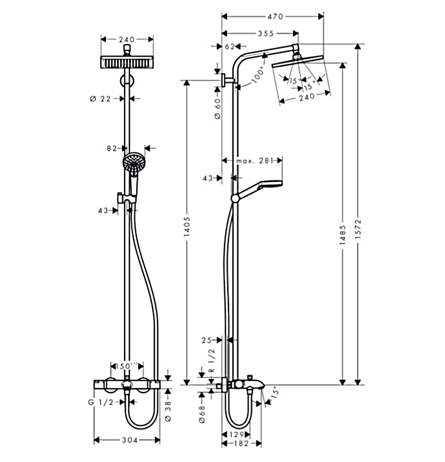 • складається з: верхній душ, ручний душ, термостат для ванни, душовий шланг, повзунок, штанга для душу