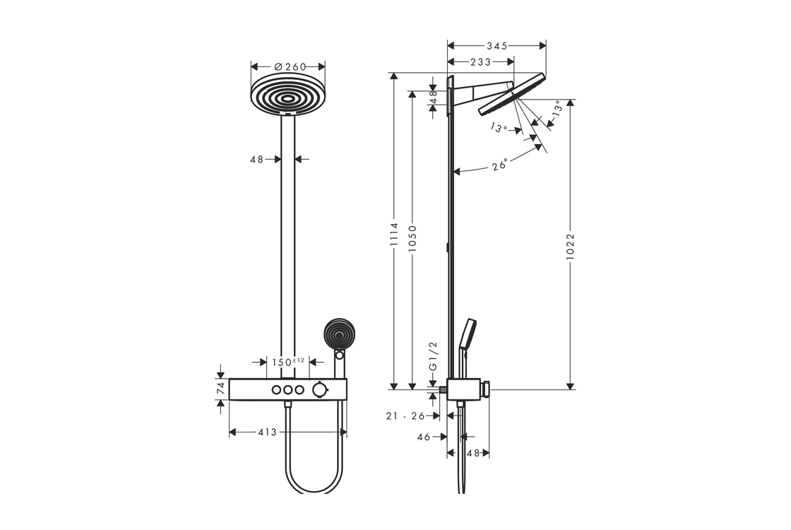 HANSGROHE складається з: верхнього душу, ручного душу, душового термостату, душової штанги, душового шланга,верхній душ Pulsify 260 2jet, тип розпилення: PowderRain, Intense PowderRain,кульовий шарнір: верхній душ регулюється кутом нахилу 13-39°,поверхня розпилювального диска: графіт,Fast Drain очищає верхній душ під кутом 10°,технологія EcoSmart (економне використання води),максимальна витрата при 3 барах: 7,5 л/хв,тип розпилення ручного душу: PowderRain, IntenseRain, Massage spray,мінімальний тиск потоку: 1,7 бар, макс. робочий тиск: 10 бар,довжина плеча верхнього душу: 233 мм,поворотний душовий кронштейн,термостат CoolContact: запобігає нагріванню корпусу, роблячи душ ще безпечнішим,термостат ShowerTablet Select 400,одночасне використання 3 функцій,підходить для безперервних проточних водонагрівачів,з'єднувальна різьба G ½,міжцентрова відстань 150 ± 12 мм,іскробезпечний проти зворотного потоку,термостат з кнопками ручного душа, PowderRain, Intense PowderRain.