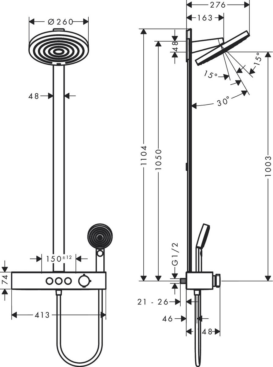 HANSGROHE складається з: верхнього душу, ручного душу, душового термостату, душової штанги, душового шланга,верхній душ Pulsify 260 2jet, тип розпилення: PowderRain, Intense PowderRain,кульовий шарнір: верхній душ регулюється кутом нахилу 13-39°,поверхня розпилювального диска: графіт,Fast Drain очищає верхній душ під кутом 10°,технологія EcoSmart (економне використання води),максимальна витрата при 3 барах: 7,5 л/хв,тип розпилення ручного душу: PowderRain, IntenseRain, Massage spray,мінімальний тиск потоку: 1,7 бар, макс. робочий тиск: 10 бар,довжина плеча верхнього душу: 233 мм,поворотний душовий кронштейн,термостат CoolContact: запобігає нагріванню корпусу, роблячи душ ще безпечнішим,термостат ShowerTablet Select 400,одночасне використання 3 функцій,підходить для безперервних проточних водонагрівачів,з'єднувальна різьба G ½,міжцентрова відстань 150 ± 12 мм,іскробезпечний проти зворотного потоку,термостат з кнопками ручного душа, PowderRain, Intense PowderRain.