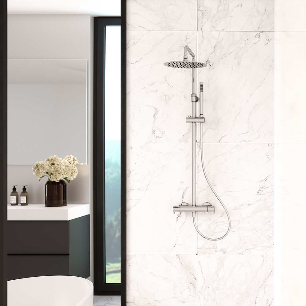 Душова система Ramon Soler ALEXIA з термостатом та регульованою висотою 880-1460 мм, хром (365402RM30036D303728) - поєднує в собі високу продуктивність, безпеку, економію та комфорт.