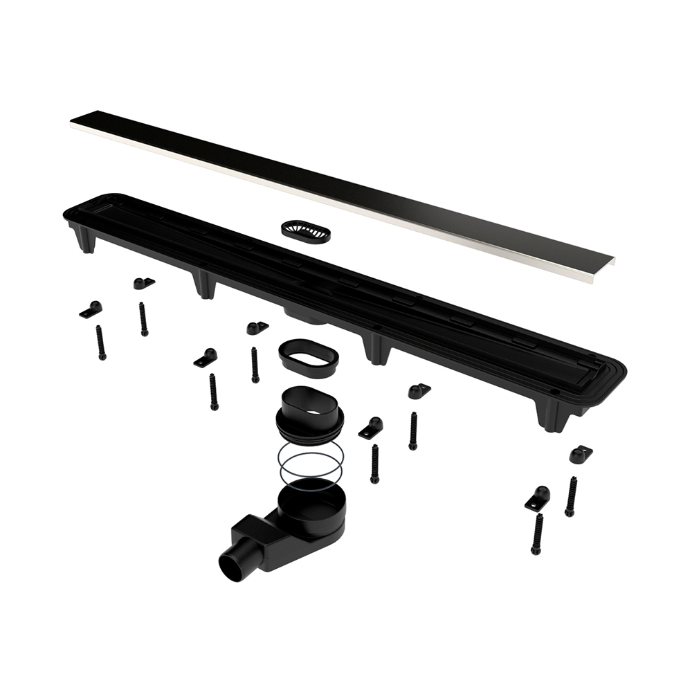 - комплектація: душовою канал - 1 шт, сифон - 1 шт, решітка для волосся 1 шт, накладка з нержавіючої сталі чорна матова 1 шт, гідроізоляційні стрічки 4 шт, монтажний набір для кріплення регульованих ніжок: шуруп D 3,5x35мм - 8 шт., дюбель 6х35 мм - 8 шт, регульовані ніжки - 8 шт