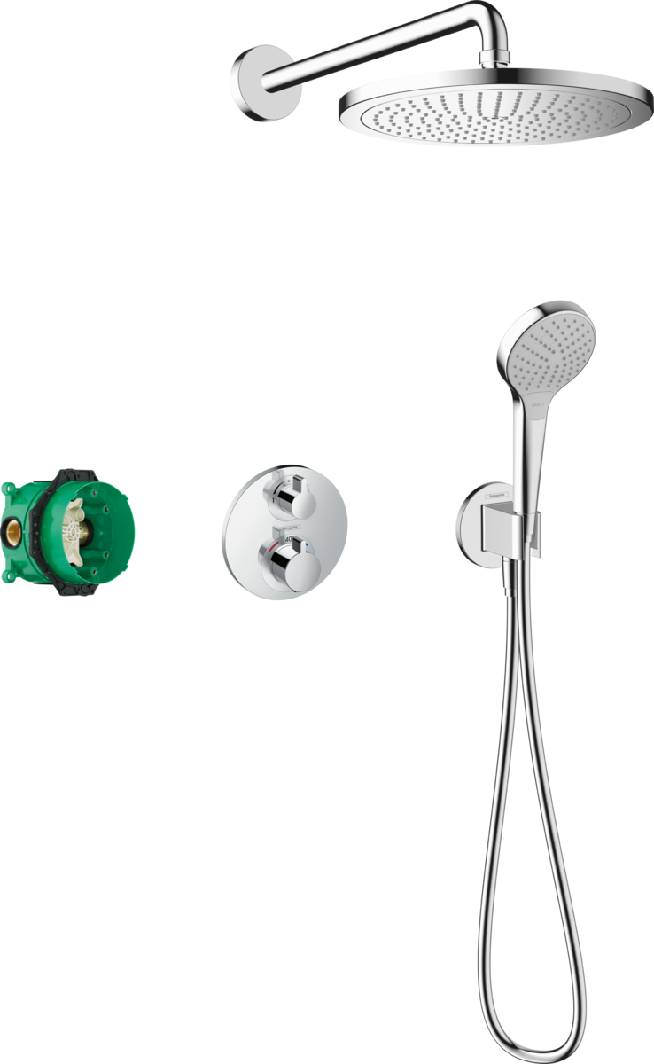 HANSGROHE складається з: верхній душ з кронштейном, ручний душ з тримачем, шланг для душу, термостат, прихована внутрішня частина.діаметр верхнього душу : 280 мм, тип струменя верхього душу: RainAirтип струменя з ручного душу: Rain, IntenseRain, TurboRain.поворотний з'єднувач запобігає заплутуванню шланга