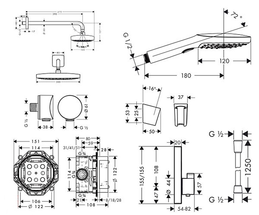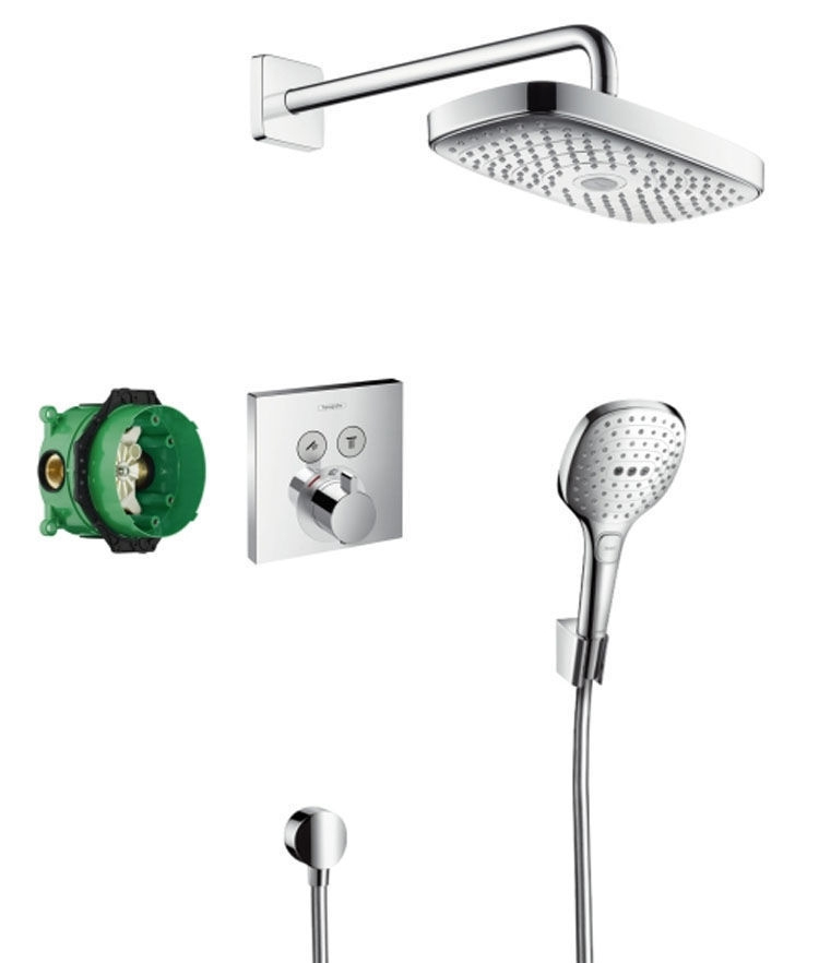 HANSGROHE складається з: верхній душ з настінним кронштейном, ручний душ, душовий термостат, внутрішня частина змішувача прихованого монтажу, тримач для душу, шлангове під'єднання, душовий шланг 1,25смрозмір душової лійки верхнього душу: 30х16 см, тип струменя: Rainручний душ тип струменя: RainAir, Rain, Whirl