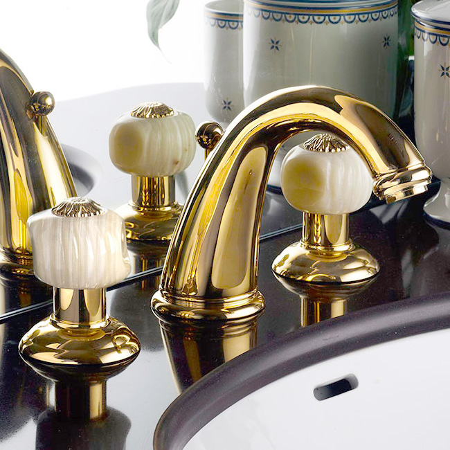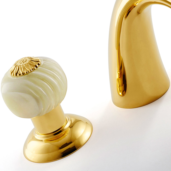 Колекція двохвентильних змішувачів Onice виготовлена з ручками з натурального каменю Онікса з елегантною огранюванням. Онікс, камінь, який є різновидом агата, він має ніжний зелений з ніжними прожилками і переливами, прекрасно поєднується з металом різних відтінків.
