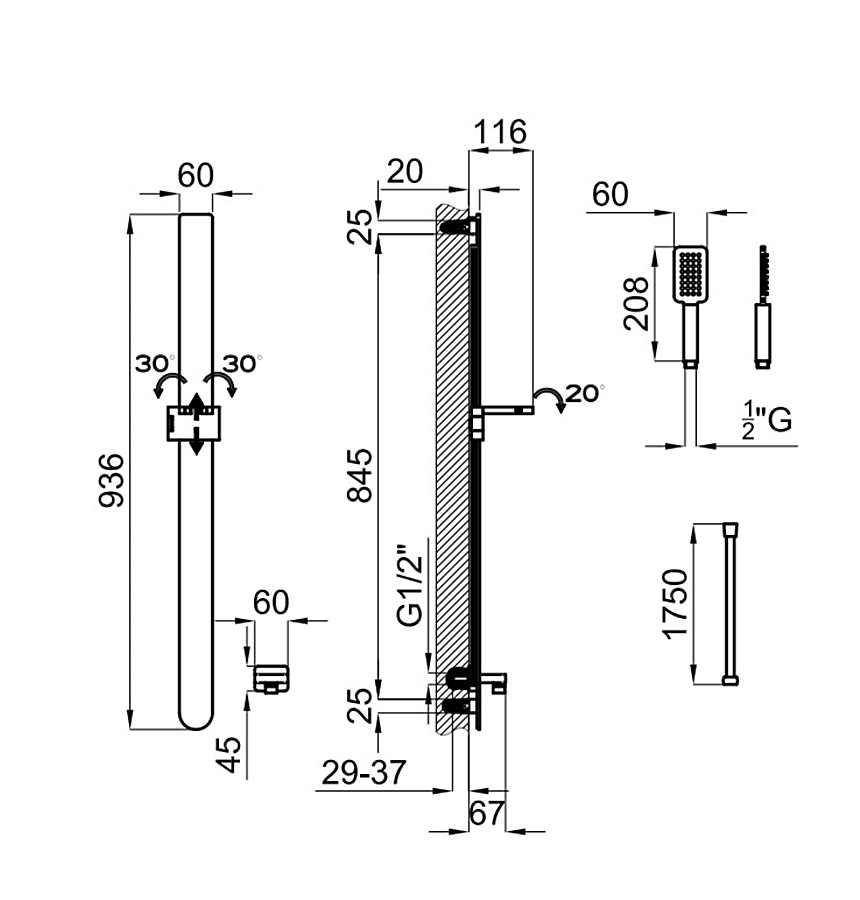 FORMA Душовий комплект (душова рейка з поворотним кронштейном + ручний душ + шланг) хромований (100143711)