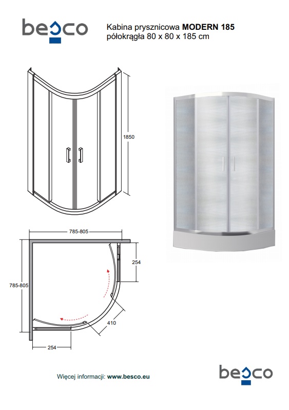 Гартоване захисне скло 6 мм. Тихі розсувні двері. Подвійні ролики високої якості. Радіус 55 см. Ширина входу: 52 см. У ціну включено стандартне покриття Besco ProClean з прозорим склом.