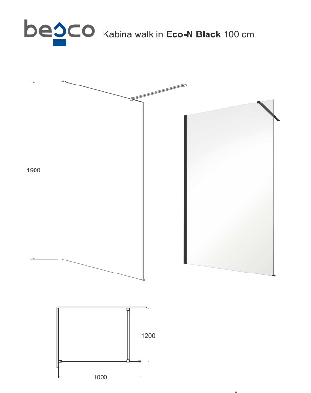 Кабіна walk in ECO-N BLACK 100x195 скло прозоре, профіль чорний мат