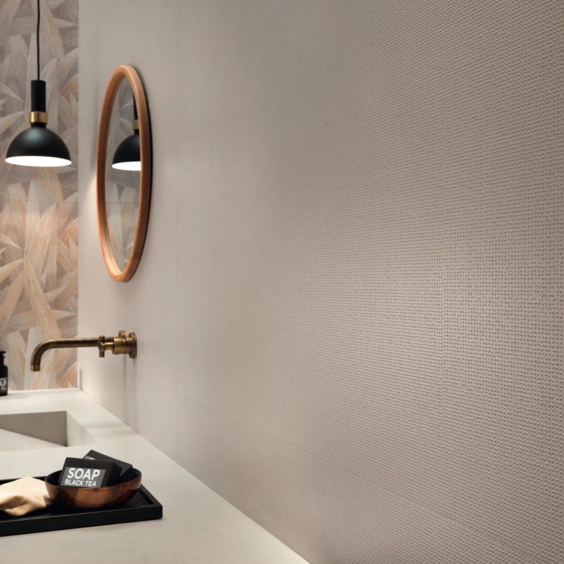 Керамограніт Aplomb - це колекція плитки з ефектом шпалер. Вона прекрасно підійде для ванних кімнат, а також для кухонь і магазинів, в яких створить по-сучасному стильну і спокійну атмосферу. Пилові непомітні тони колекції широко використовуються в інтер'єрного дизайну і легко поєднуються з іншими елементами обстановки. У фактурах Minidots і Stripes, створених з тонко блискучого матеріалу, дрібні точки або тонкі лінії м'яко виступають, тон в тон, на приглушеному матовому тлі.