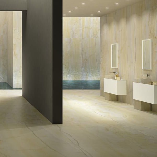 Керамограніт Fiandre Marmi Maximum Gold Onyx Semilucidato 6 мм 75x75 (MMS25677) - сприяє підвищенню сприймають цінності будь-якого середовища, поважаючи і покращуючи стилістичний вибір дизайнера та побажання клієнта.