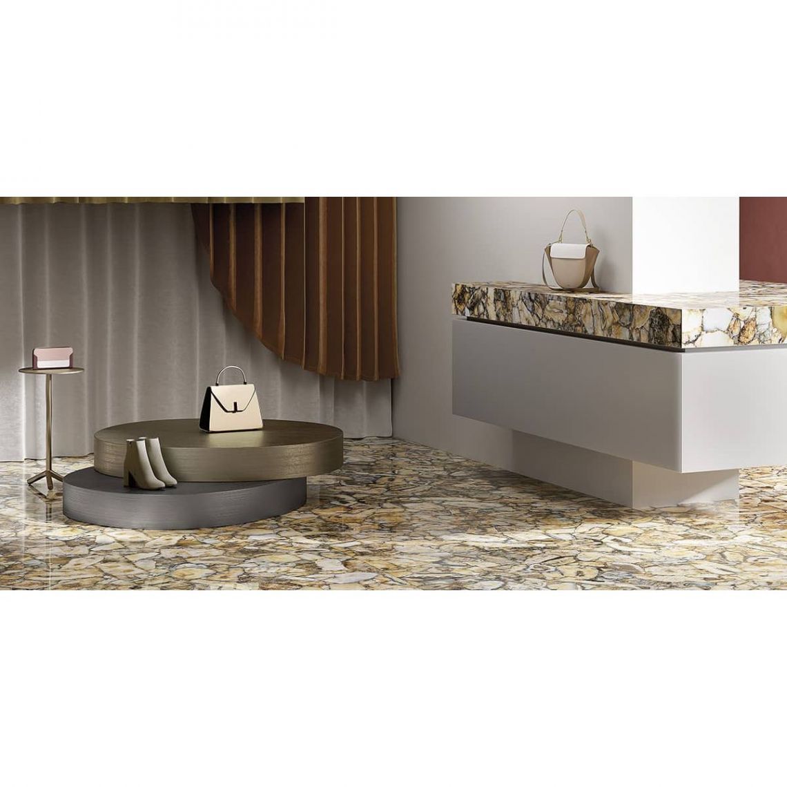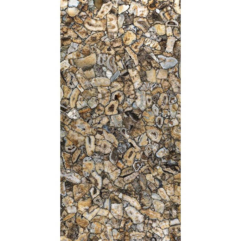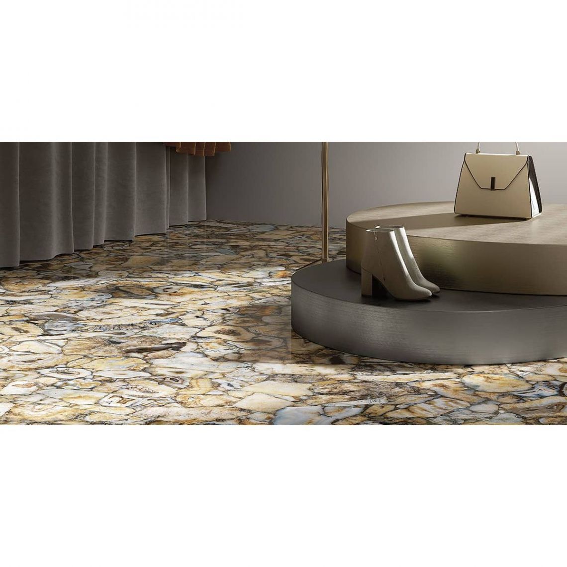 Неправильні і концентричні форми, багаті контрастом і відтінками, дають плитці відчуття глибини і відтворюють напівпрозорий ефект, характерний для агату.