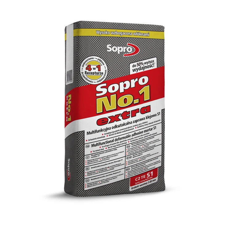 ОПИС Sopro №1 400 extra – клейовий еластичний склад, призначений для укладання різних видів облицювання. Клейова суміш розроблена на основі цементу з додаванням спеціальних волокон і домішок, які посилюють міцність. ПРИЗНАЧЕННЯ ПЛИТКОВОГО КЛЕЮ SOPRO 22,5 КГ Клей підходить для приклеювання плитки та керамічних плит, мозаїки, архітектурного бетону, а також стійкого до фарбування натурального каменю. Клей Sopro №1 400 extra, крім основного призначення, може використовуватися для вирівнювання поверхні із шаром завтовшки до 20 мм. Його можна використовувати всередині та зовні, у вологих приміщеннях, а також басейнах. Загалом – це універсальна суміш, яка дозволяє легко встановити плитку. ВЛАСТИВОСТІ КЛЕЮ ДЛЯ ПЛИТКИ SOPRO 22,5 КГ Серед характеристик клею варто зазначити: високу стабільність завдяки наявності у складі зміцнюючих волокон; простоту у застосуванні; можливість використовувати як шпаклівку; температура застосування від +5 до +30 градусів за Цельсієм; може використовуватися для великоформатної плитки та гресу. Клей є сухою сумішшю цементу, клею та домішок. Для приготування суху суміш засипають у воду і ретельно перемішують до утворення однорідної маси. Пропорції залежать від типу плитки, дізнатись інформація можна на упаковці.