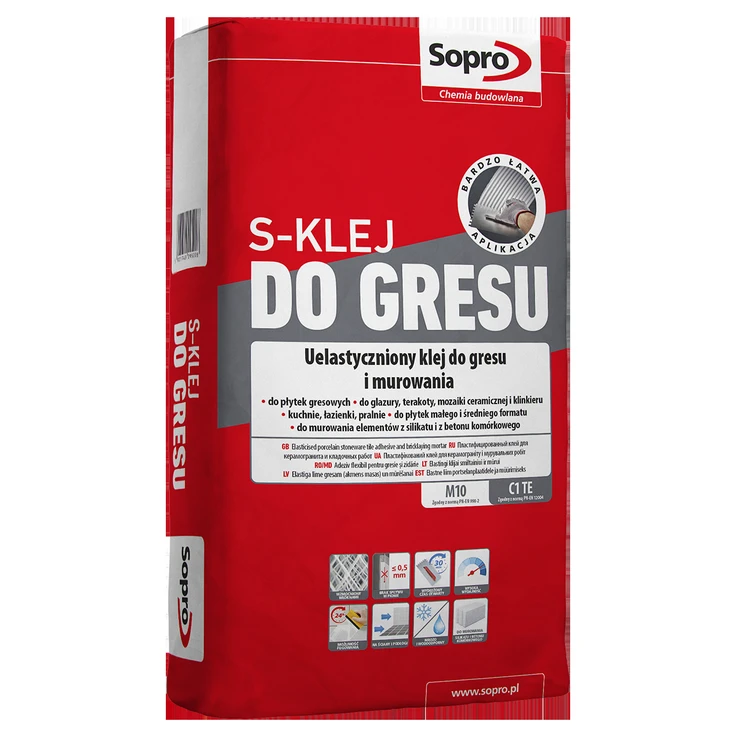 Клей C1 TE (згідно PN-EN 12004), тонкошаровий, еластичний, сірий, з волокнами. Для керамічної плитки (0,18 м2 / до 60 см сторона ) і темного натурального каменю, стійкого до зміни кольору і деформації. Для використання в житлових, вологих приміщеннях, а також в комунальних приміщеннях, офісах, медичних службах, готелях. Також кладочний розчин класу М10 (відповідно до PN-EN 998-2) - для тонкошовної цегляної кладки внутрішніх і зовнішніх стін, колон - з пористого бетону, силікату. Для бетону: витриманий мін. 6 місяців. Для стін та підлоги без підігріву в середині приміщення та ззовні. Температура застосування: +5 / + 30 ° С. Час використання: 3-4 години. Ходіння / затирка плитки: через хв. 24 години. Корисні навантаження: через 3 дні, душ у басейні після 21 днів. Витрата: 1,2 кг / м2 / 1 мм.