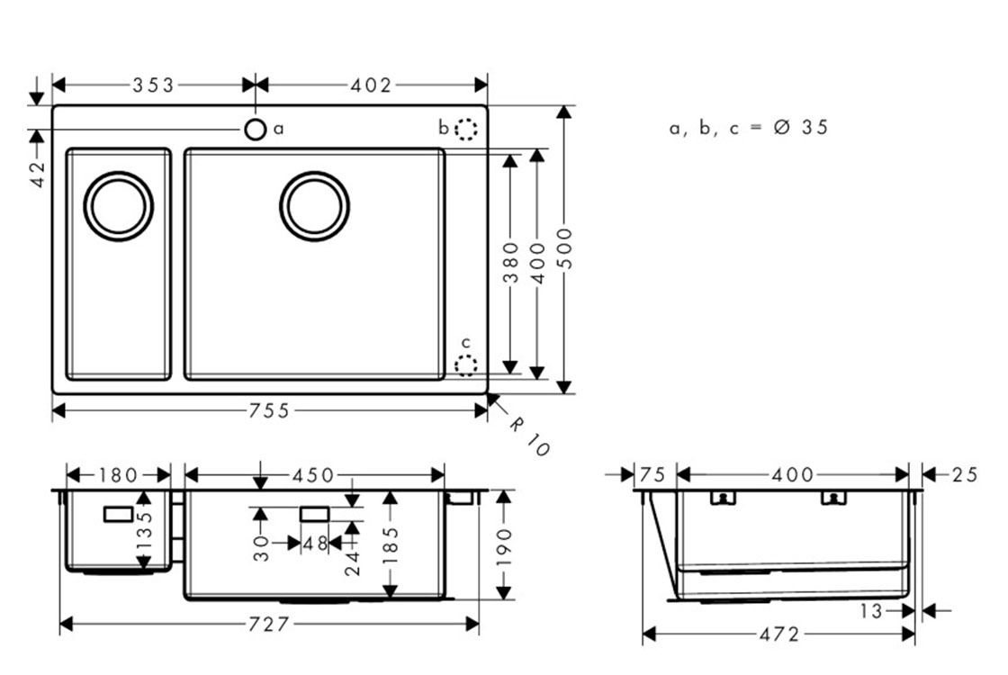 розмір: 755x500 мм,1 основна чаша і 1 додаткова чаша,тип монтажу: плаский на стільницю (самообрамлення) або врізний монтаж,глибина раковини: 190 мм,глибина напівмийки: 135 мм,радіус кута: 10 мм,необхідне додаткове обладнання: сифон D15-10 з переливом для мийки зі сталі на дві чаші (арт.43922800) Stainless Steel (не входять в комплект).
