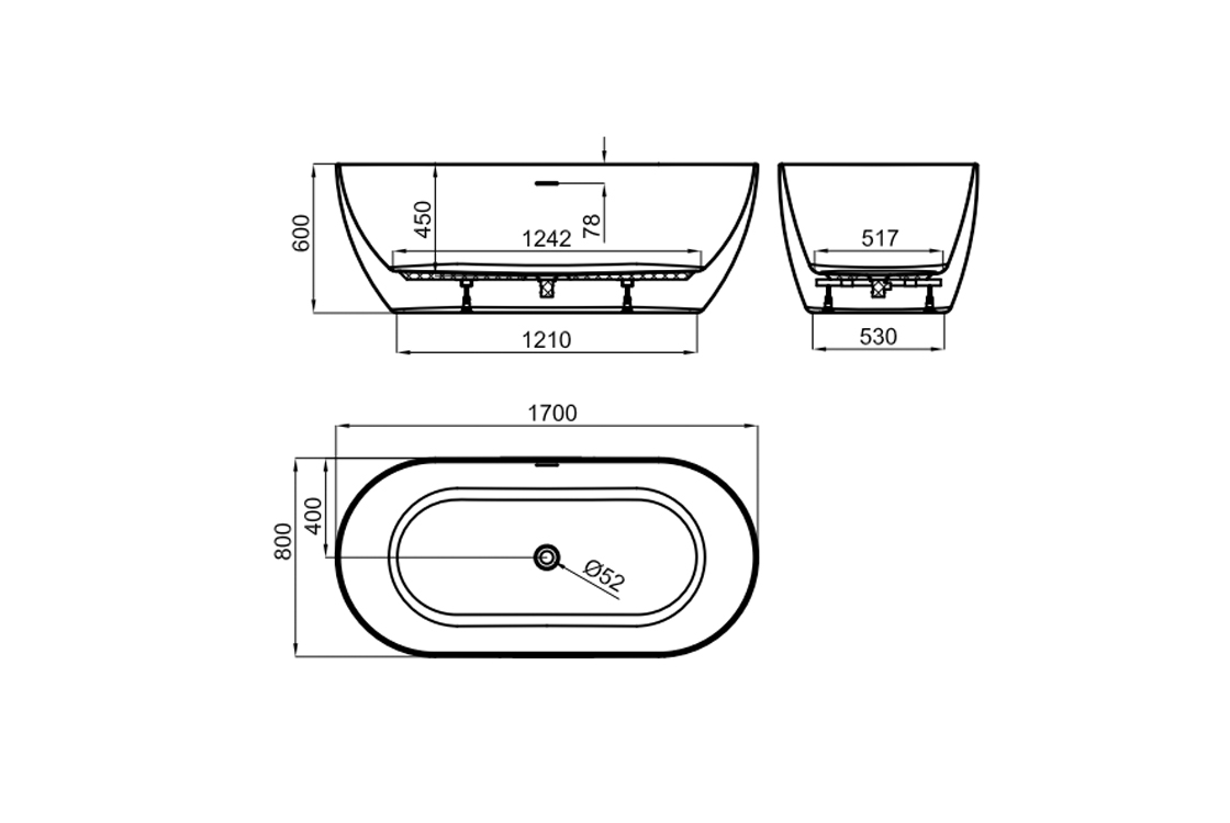 Вільностояча ванна довжиною 170 см, шириною 80 см, змішувач і сифон в комплект не входять