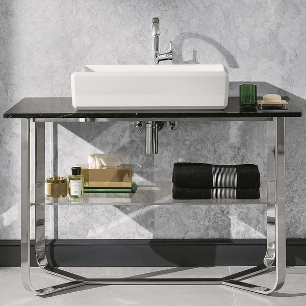 Мармурова стільниця з консоллю з нержавіючої сталі Villeroy & Boch Antheus B06400RP призначена для раковин Villeroy & Boch Antheus 4A1065 . Встановлюється біля стіни з фіксацією. У моделі використовується мармур кольору Nero Marquina.