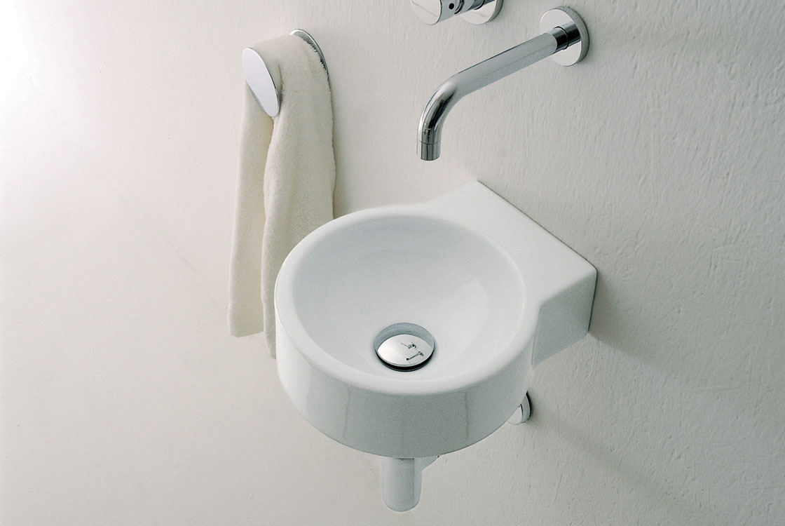 Компактний умивальник підвісний, круглої форми, без переливу, з отвором під змішувач