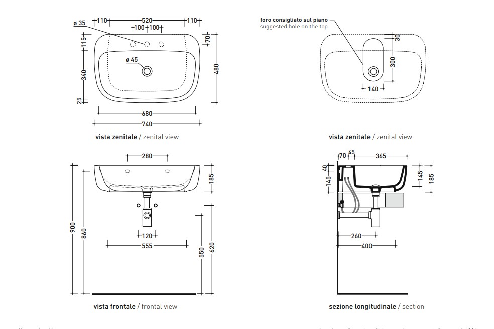MONO 74 Умивальник з 1 отвором під змішувач (MN74L)