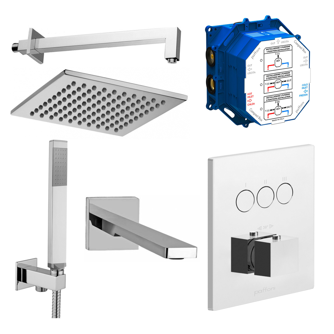 Набір для душової системи прихованого монтажу Paffoni з термостатом, верхнім та ручним душем, зливом, хром (Kit Compact-T Quadro B)