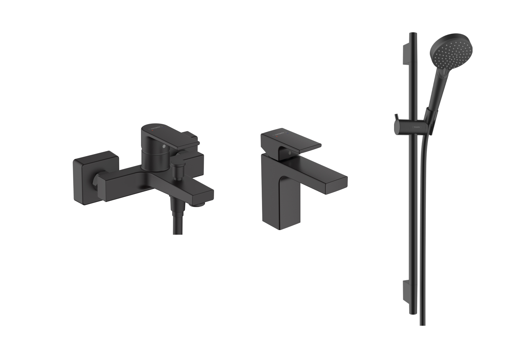 В комплекті:Змішувач Vernis Shape 100 для умивальника з донним клапаном pop-up, Matt Black (71561670), максимальна витрата при 3 барах: 5 л/хв,Змішувач Vernis Shape для ванни, Matt Black (71450670), максимальна витрата при 3 барах: 22,5 л/хв,Душовий набір Vernis Blend Vario EcoSmart S Puro 65 см, Matt Black (26423670), складається з: ручного душу, душової штанги, душового шланга, повзунка, максимальна витрата при 3 барах: 9,7 л/хв.