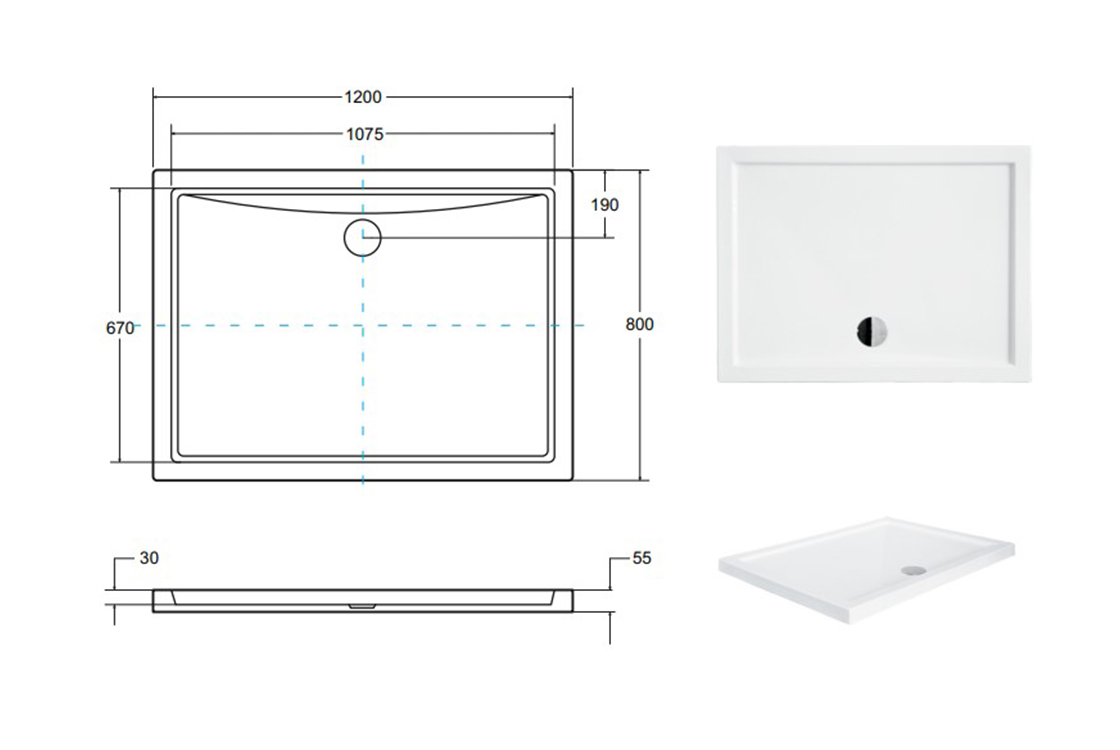 Довжина піддона 1200 мм., ширина - 800 мм., висота - 55 мм., глибина - 30 мм., а діаметр отвору для зливу - 90 мм.