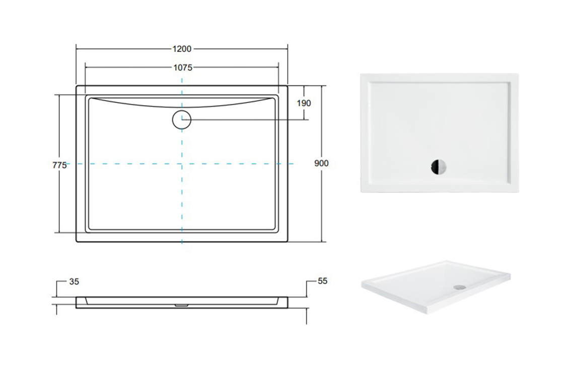 Довжина піддона 1200 мм., ширина - 900 мм., висота - 55 мм., глибина - 30 мм., а діаметр отвору для зливу - 90 мм.