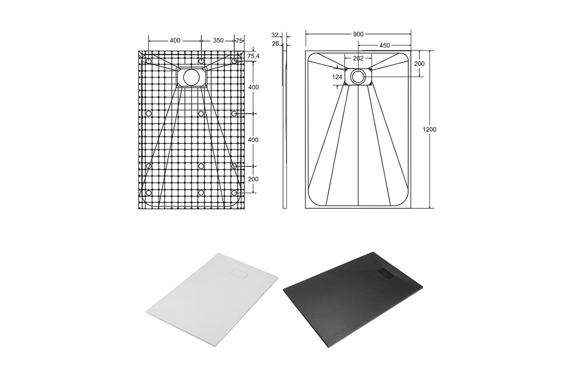 Піддон VEXO білого кольору в комплекті з сифоном. Підходить до прямокутних душових кабін.