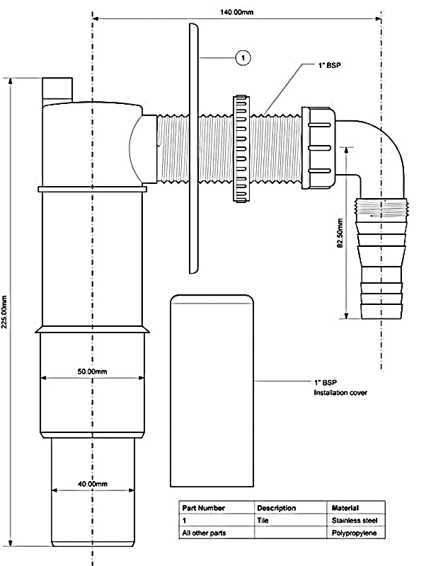 Підключення до пральної машини або посудомийної машини. Розміри: 40 / 50мм. Пропускна спроможність - 64 л / хв.