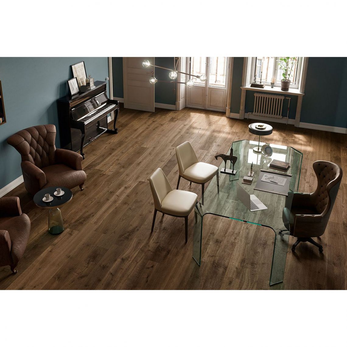Зміни кольору дерев'яного підлогового покриття, викликані впливом світла протягом тривалого періоду часу, були реалістично відтворені в плитці з імітацією дерев'яних плит і рейок, в якій відтінки варіюються від інтенсивного коричневого кольору до світлого пшеничного, від медового до бурштинового.