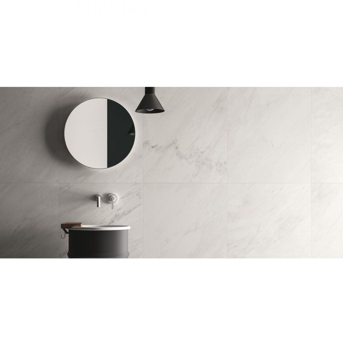 Керамограніт Fiandre Marble Lab Premium White Sl. (AS191X860). Джерело натхнення - з самої північній частині Егейського моря, білизна його поверхні порушується тільки блідим, ледь помітним помутнінням. Блідий камінь майже не чіпатимуть слабкими прожилками, що утворилися з часом і згодом розшаровуються. Ніжний, немов дорогоцінний шовк, цінний, як натуральна перлина, але в той же час - міцний і могутній, яким може бути тільки білий мармур.