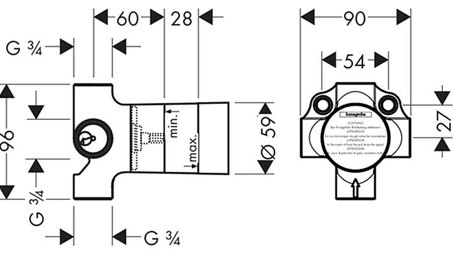 Керамічний картридж, ущільнювальний фланець. Можливо одночасне включення 2 споживачів (душів). Підходить для всіх комплектів зовнішньої частини Quattro. Витрата води: 65 л/хв.