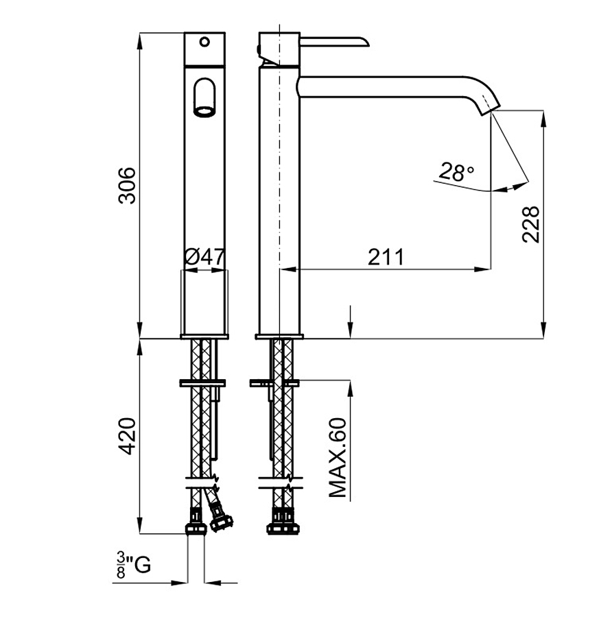 Одноважільний змішувач для умивальника висотою 306 мм. Підключення 3/8 дюйма. Керамічний картридж Ø35 мм. Без зливного комплекту. Аератор «Плюс». Витрата при 3 барах 5 л/хв.