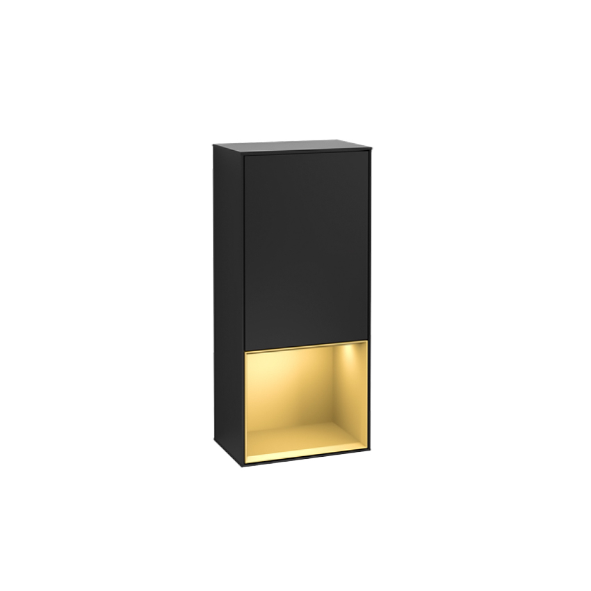 Шафа бічній Villeroy & Boch Finion (G550HFPD) з однієї дверцями, 1 відкритій полицею і 1 скляною полицею всередині. LED-підсвітка відкритої полки і настінної частини (1x LED / 2,3Вт. 2x LED / 6,9Вт. A-A ++. 2700K нейтральний білий / 6480K білий денне світло). Петлі справа.