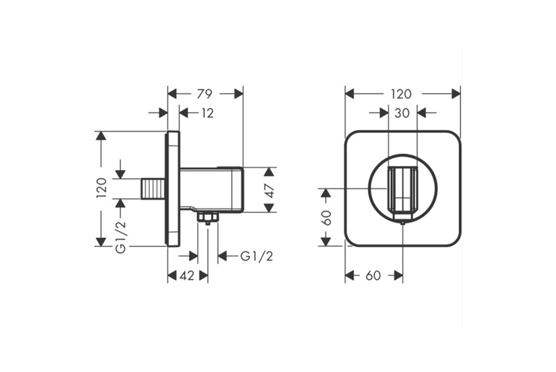 Axor інтегрована функція підтримки,металевий кут з'єднання,зворотний клапан,тип з'єднання: G ½,у з’єднаній установці (відстань 10 мм) ми рекомендуємо для ідеального поводження лише горизонтальну установку,у з’єднаній установці (відстань 10 мм) необхідно використовувати базовий набір для душу Axor (арт.28486180) ( не входить в комплект),при вільному встановленні (відстань понад 10 мм) базовий комплект не потрібно,для душових шлангів з конусною гайкою.