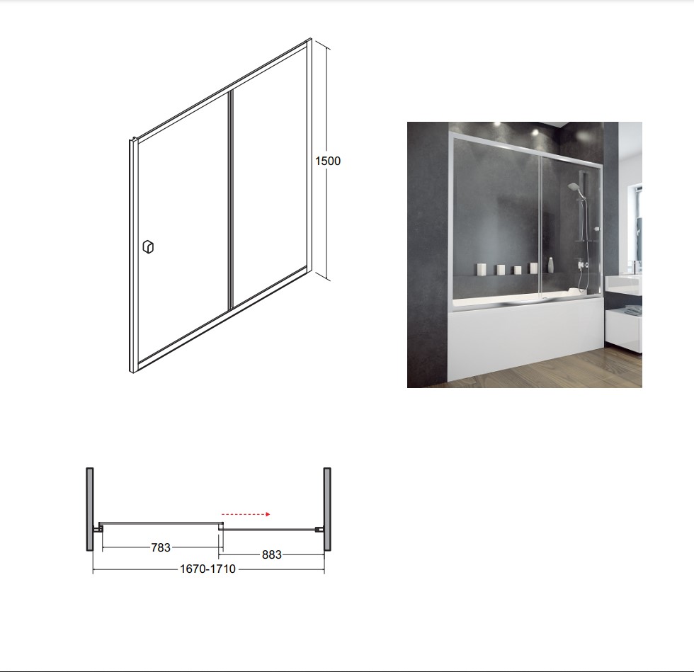 Безпечне гартоване скло 6мм, Висота 150 см Ширина 170 см. Підходить для ванн довжиною 170 см. Додатково може комплектуватись боковою панеллю шириною 70 см