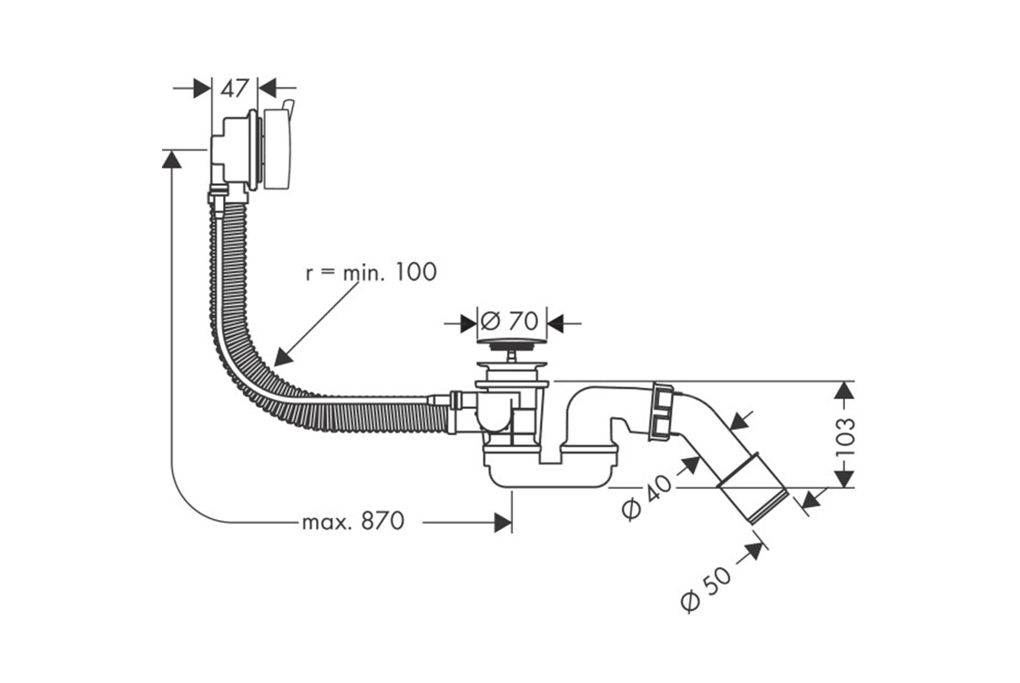 Призначений для не стандартних ваннскладається з: базового набору, сифона для ванни, фінішного набору,PE гвинтове з'єднання G 1½ x 40/50 мм,довжина троса боудена 780 мм.