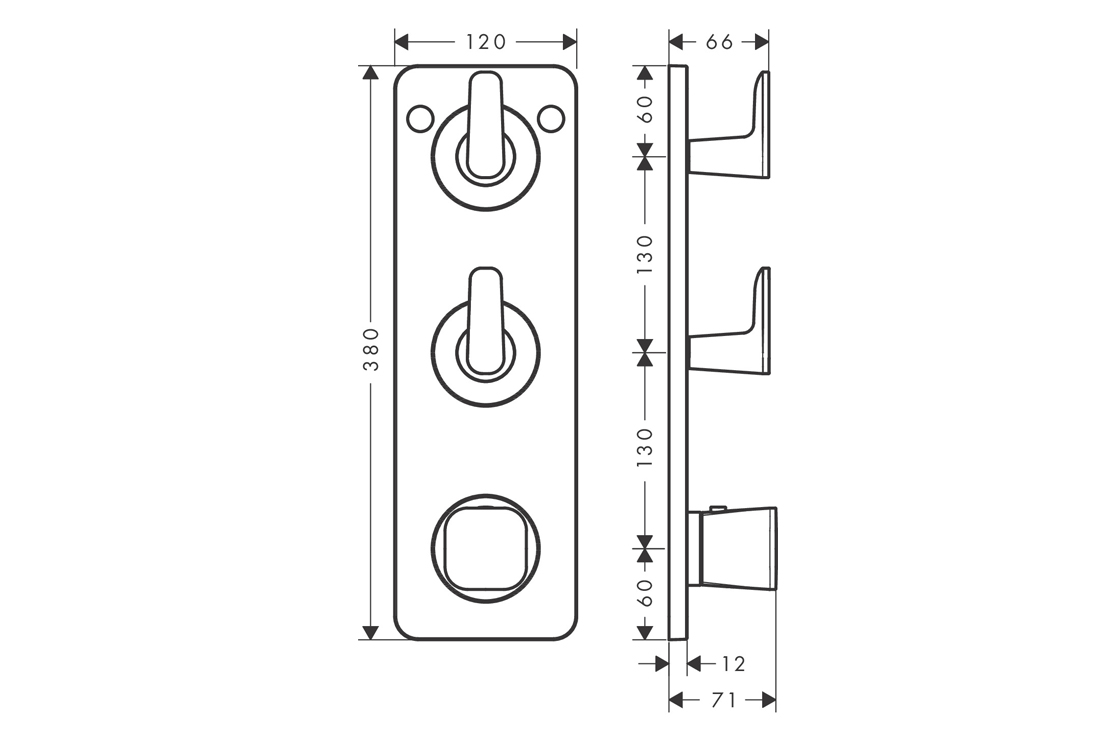 2 функції;одночасне використання 2 функцій;максимальна витрата при 3 барах: 42 л/хв;витрата верхній вихід: 42 л/хв;витрата нижній вихід: 40 л/хв;мін. робочий тиск: 1 бар;макс. робочий тиск: 10 бар;комбінація термостата високої витрати із запірним клапаном і подвійним перекидним клапаном для керування 2-ма споживачами;безпечна зупинка при 40 °C;регулюється обмеження температури;тип підключення: базовий комплект;необхідне додаткове обладнання: прихована частина для термостата зі стіни 380/120 на 2 функції (арт.36701180) (не входить в комплект)
